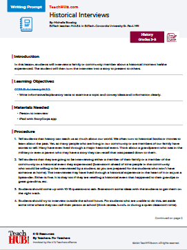 In this lesson, students will interview a family or community member about a historical moment he/she experienced. The student will then turn the interview into a story to present to others.